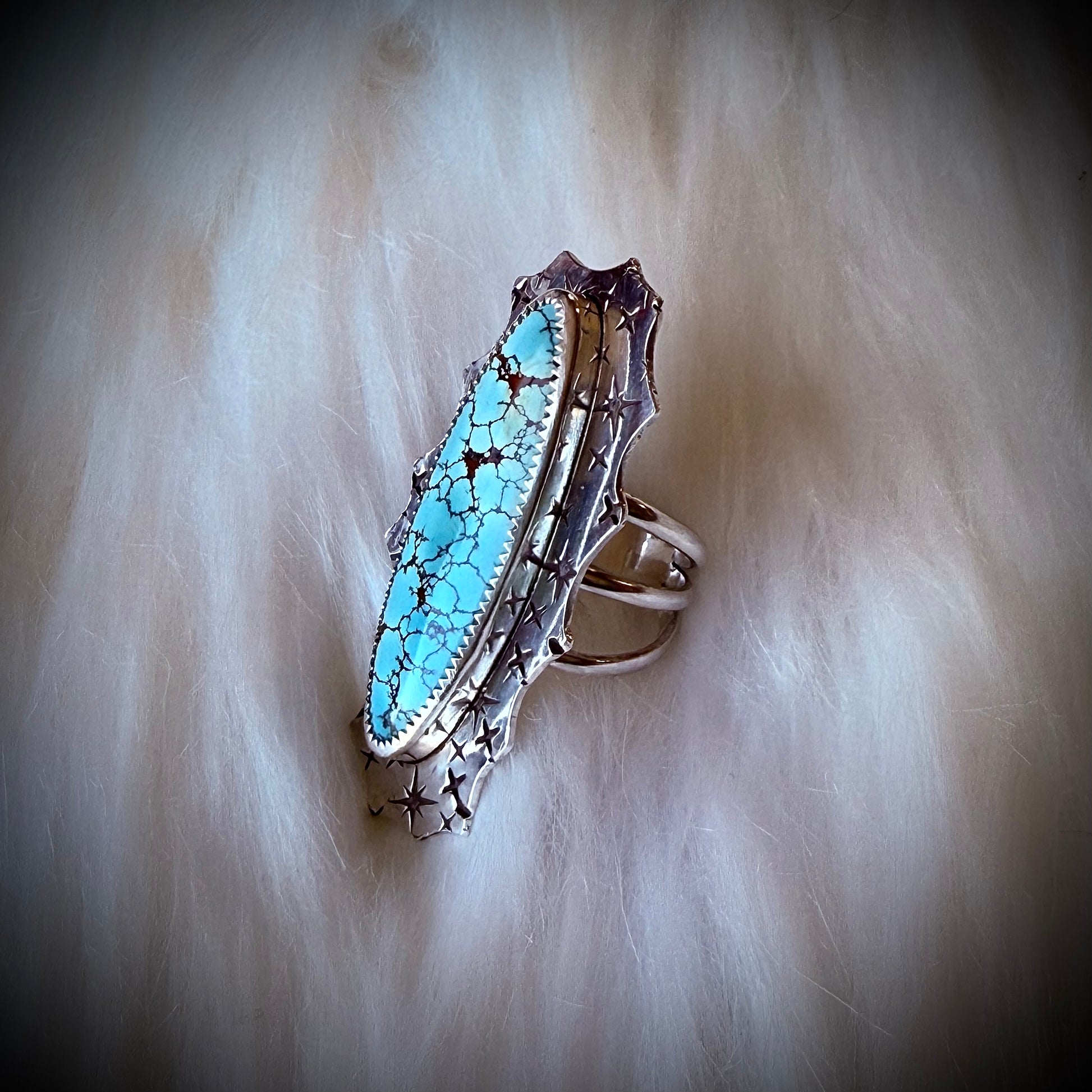 This ring features a long, natural Carico Lake turquoise stone with dramatic matrix, framed by hand-fabricated silver and hand stamped stars—each mark pressed individually, leaving no two surfaces the same.